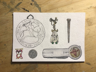 We have a shelf with... stuff on it. It's maybe 50% heirlooms. Maybe 30%. Enough that I think of it as the heirloom shelf. I acquired some new stuff at the last family reunion, and was inspired to have a go at drawing it. And a nail. The nail is one of those not-an-heirloom objects that is part of the inspiration-objects Venn Diagram. Look, you can see the composition works better with the nail.